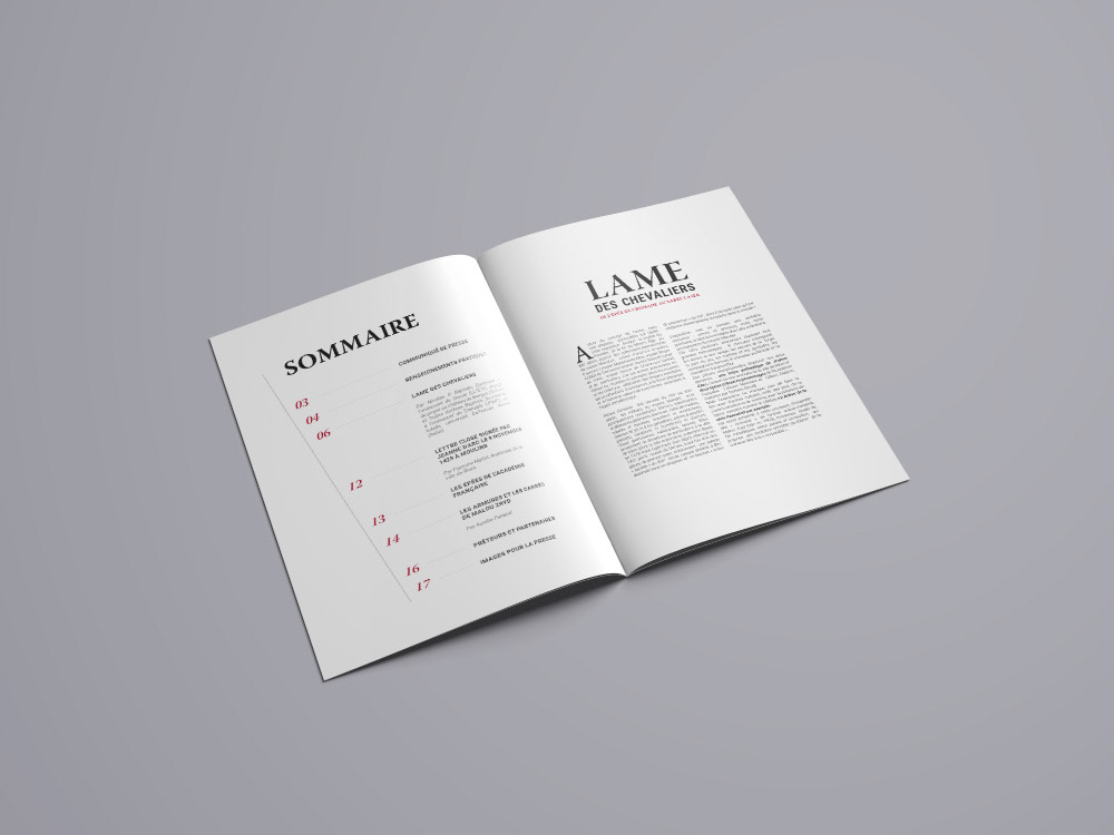 Réalisation de la mise en page du dossier de presse de l'exposition "Lame des chevaliers"